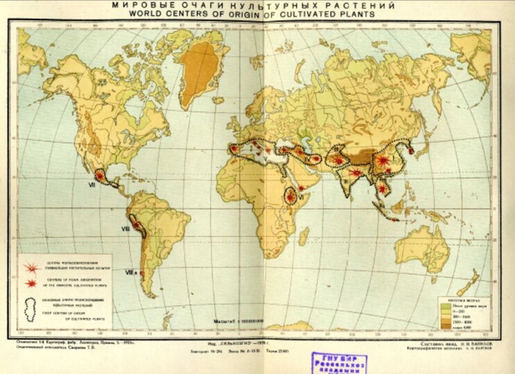 Карта времен Вавилова с пометкой мировых очагов культурных растений. Фото: ВИР.