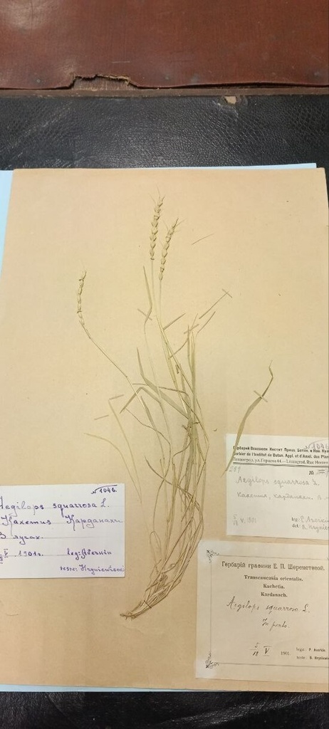 Мы заходим в помещение, где так называемые типовые гербарные образцы культурных растений и их диких родичей хранятся с конца XIX века. Здесь можно найти гербарные образцы, собранные когда-то не только учеными, но и представителями знатных сословий. Руководитель отдела Ирена Чухина показывает мне гербарий, созданный графиней Екатериной Шереметевой. Это эгилопс — дикий родич пшеницы, сорванный ею в Грузии.