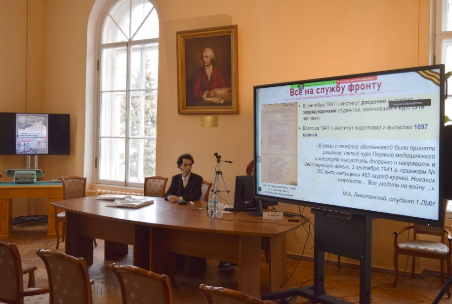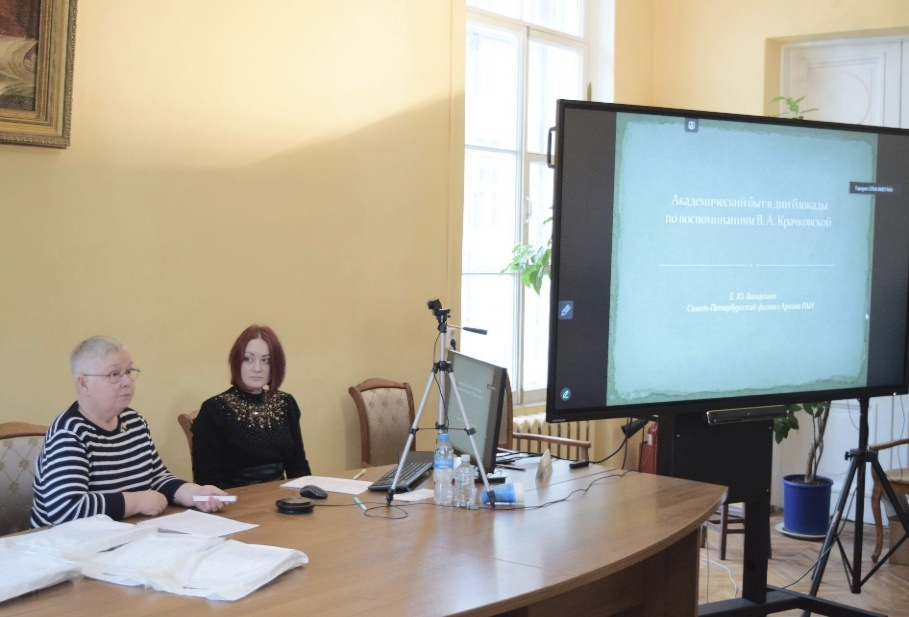 Отдельное внимание на сессии было уделено влиянию Великой Отечественной войны на академический быт и работу научных учреждений. Этой теме был посвящен круглый стол «Ученые и Великая Отечественная война». Модератором выступила старший научный сотрудник СПбФ ИИЕТ РАН, кандидат биологических наук Анна Федорова. Участники обсудили мобилизацию научных ресурсов страны для помощи фронту, вклад ученых в развитие оборонной промышленности, направления исследований и научные достижения в годы войны. Старший научный сотрудник СПбФ АРАН, доктор исторических наук Екатерина Басаргина представила доклад «Академический быт в дни блокады по воспоминаниям В.А. Крачковской», в котором рассказала о мужестве востоковеда, историка искусств Веры Крачковской и её мужа, академика РАН Игнатия Крачковского, которые несмотря на страшную блокадную зиму 1941-1942 гг., продолжали заниматься научной работой. При всех трудностях военного времени учёным удалось сохранить высокий уровень прикладных исследований и продолжить многие фундаментальные изыскания. Докладчики продемонстрировали исключительную значимость их работы для обороны страны и неоценимый вклад поколения победителей в развитие науки.