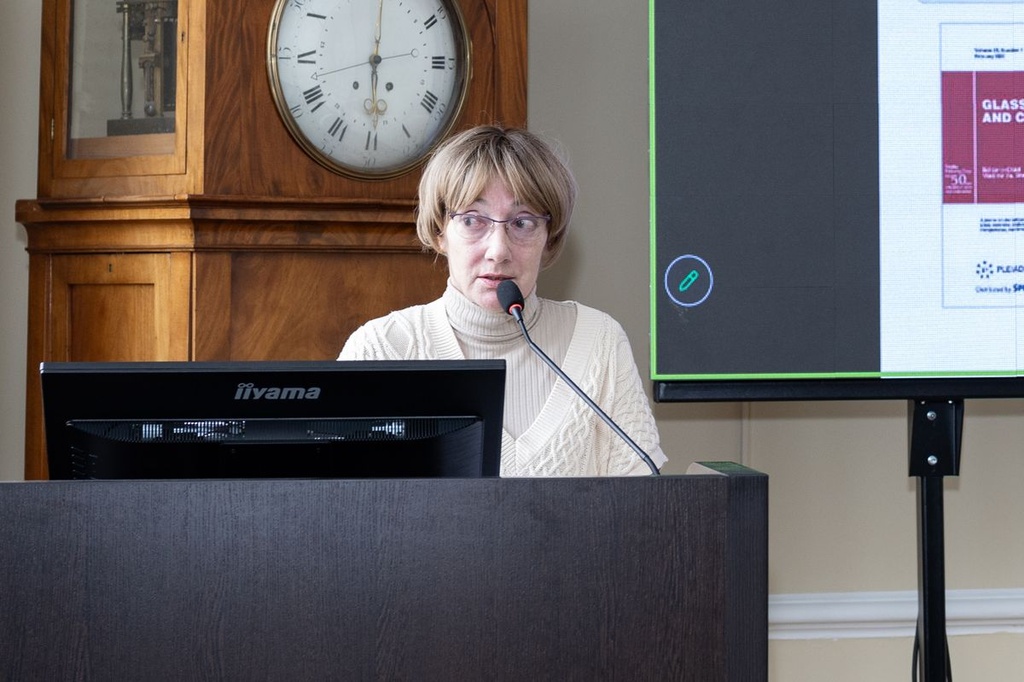 О развитии научных исследований в области химии стекла рассказала ведущий научный сотрудник ИХС РАН Татьяна Цыганова. В докладе «Стекольное направление в Институте химии силикатов: прошлое и настоящее», подготовленном совместно с заведующей Лабораторией физической химии стекла Татьяной Антроповой, были представлены исследования по созданию новых специальных стекол и материалов для фотоники, микроэлектроники, спинтроники и других направлений.