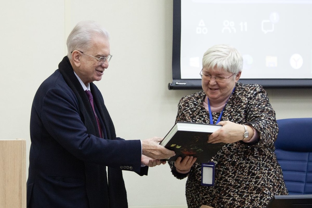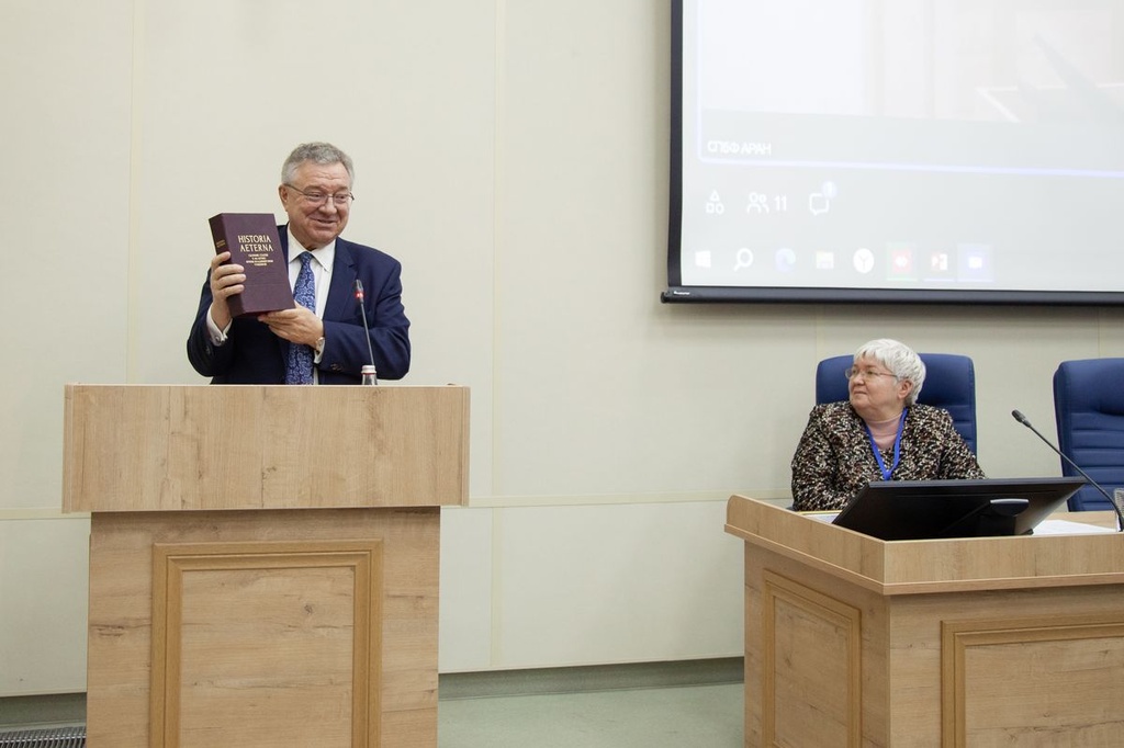 От имени Санкт-Петербургского отделения Российской академии наук Андрей Рудской вручил юбиляру первый экземпляр фундаментального сборника «HISTORIA AETERNA: осмысляя историческое наследие...», изданного при поддержке СПбО РАН к 65-летию Ирины Владимировны Тункиной. В сборник включены статьи по истории архивных учреждений, а также по истории научных исследований – от Античности до сегодняшнего дня.